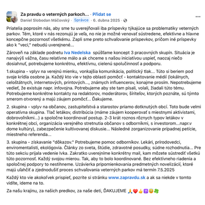 In the aforementioned petitions, Máčovský demanded that residents of municipalities decide on each wind farm project in referendums. He then actively promoted them in his Facebook group “For the Truth About Wind Farms.” He also advised his Facebook group members on how to contact local residents or municipal councils in areas where wind farms are planned and how to initiate a referendum.